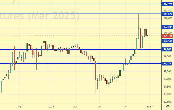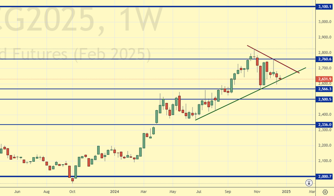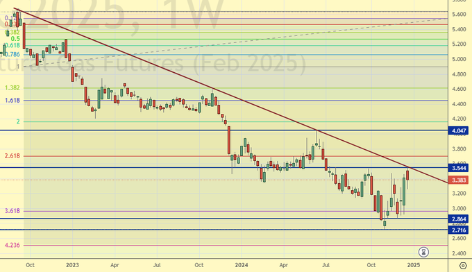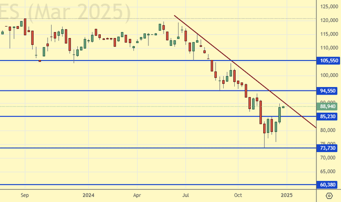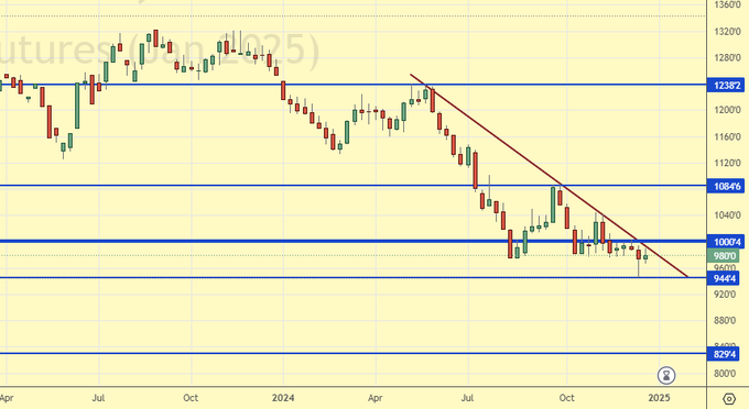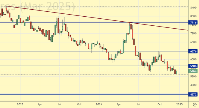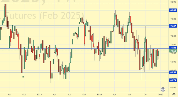 На конец декабря 24-го года нет признаков того, что зерновым будет нанесен существенный ущерб. Неудача, а она будет с очень большой долей вероятности в российском сельском хозяйстве, с падением валового сбора пшеницы до 78 млн. тонн в сезоне 24/25, будет скомпенсирована другими странами экспортерами. В том числе и ЕС, где дела по зерновым складываются лучше прошлого года. Таким образом, фундаментального повода для сильного роста цен на зерновые мы на данный момент не видим. Отметим, тем не менее, если Китай сохранит интерес к закупкам зерновых именно у США, и остановки взаимной торговли между этими двумя странами не будет, это может качнуть американский рынок вверх.