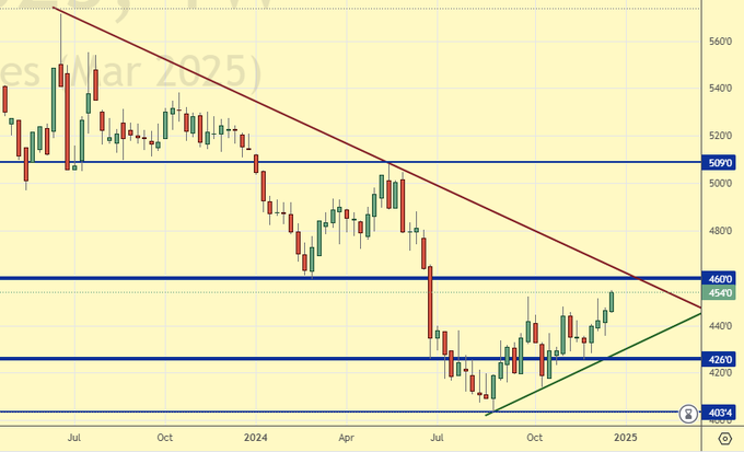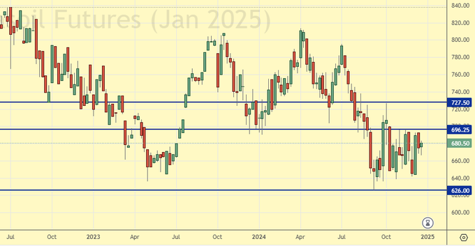 Сценарий роста: существенный рост на рынке пшеницы видится маловероятным событием. При этом, в случае падения к 430.0 можно рассмотреть возможности для покупок. Если мы сможем подняться до 700.0 в 25-году, то для быков это будет успех.