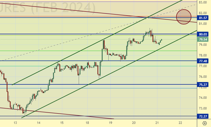 В Йемене хуситы объявили мобилизацию для участия в войне в Секторе Газа. Ближний Восток начинает закипать, что может привести к логистическим проблемам при транспортировке нефти. Люди далеко не всегда выбирают деньги. События в Красном море будут держать рынок в напряжении, что может стать причиной хода выше 81.50. Данный уровень мы пока рассматриваем как важное сопротивление в данный момент.
