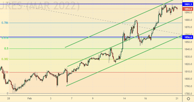 На фоне возможных переговоров Путина с Байденом золото может немного отойти от максимумов, однако, ни о каком переломе тренда говорить не приходится. Мы способны откатить к 1850.0, но вряд ли пойдем ниже.