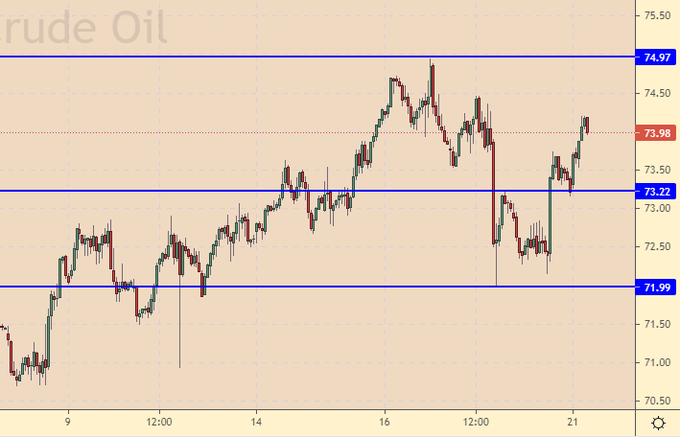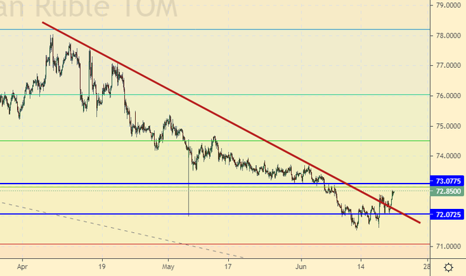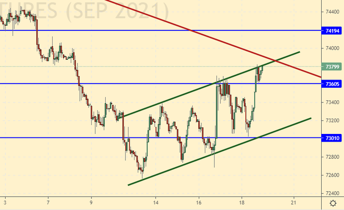 Текущее движение вверх не выглядит ультимативно, тем более что нефть пока остается высоко. Однако, после взятия долгосрочной линии сопротивления возникает перспектива движения в район 75.00, будем это учитывать. После роста выше 73.10 можно добавить к открытым ранее лонгам.
