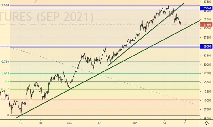 Если мы пройдем вниз 160000, то мы окажемся на 155000. Для более сильного падения нужен негатив. Заявленные новые американские санкции после встречи Путин – Байден создают тревожную атмосферу, но пока масштаб вредительства со стороны США не ясен рынок не будет торопиться с реакцией.