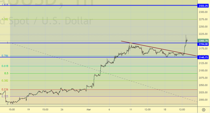Рынок не дал себя взять на откате, как такового хорошего снижения цен мы не увидели. Что делать? Если вы в позиции вверх, то держать, если нет, так как мы, то ждать откат. Теперь уже в район 2150. Покупка по текущим ценам имеет смысл при условии, что вы смотрите уже в район 3000 долларов унцию.