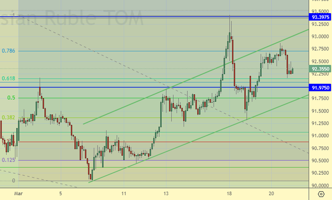Последовательно растущие минимумы ведут нас к 97.00. Да, в теории есть шансы на откат куда-то к 88.00, но пока мы не увидим собственными глазами снижения, размышлять о продажах в текущей ситуации мы не будем, какой бы привлекательной она не была для входа в шорт.