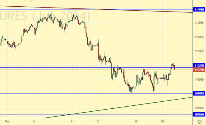 Видим попытку растолкать рынок наверх. Пока она смотрится слабо. Скорее всего мы усилим свои позиции на продажу в случае падения рынка ниже 109500. Если рост индекса не состоится на фоне выплат прекрасных дивидендов за 2023-й год, то нам уже не поможет ничего.
