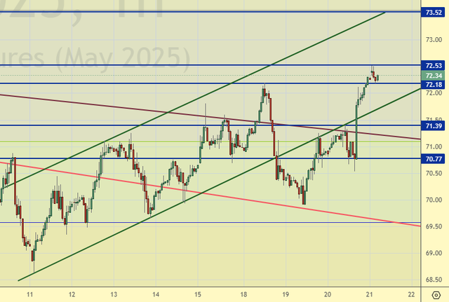 Весна усиливается, шизофреники встают на крыло, как саранча летом: США ввели санкции против Китая, потому что Китай покупает неправильную нефть, которая не освещена протестантским пастором. Нефть из Ирана, как она может быть протестантской, не ясно. Рынок шарахнулся вверх и вылез выше 72.00 с претензией на закрепление, что откладывает сценарий хода на 60.00. Но это не означает, что нефть не сможет продолжить падение, так как прогнозы экономистов не утешительны: нас ждет замедление экономики и замедление потребления энергоресурсов.