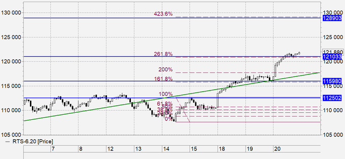 За счет роста цен на нефть и укрепления национальной валюты мы смогли подняться выше 121000, пройдя за день более 5000 пунктов. Вверху у нас цель на 128000, но для её достижения спрос на рубли и на нефть должен оставаться высоким.