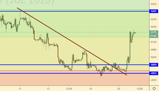 Покупатели не стали затягивать интригу и бросились вчера скупать контракты на пшеницу. Рывок, как ему и положено, был стремительным, неожиданным и рост составил сразу 3%, чтобы никто ничего не успел сделать. В этом и есть польза предварительной подготовки к торгам, так как, когда события начинают разворачиваться думать уже некогда. Мы рекомендовали покупки в случае роста выше уровня 500.0 центов за бушель и надеемся, что вчера вы вошли в лонг.