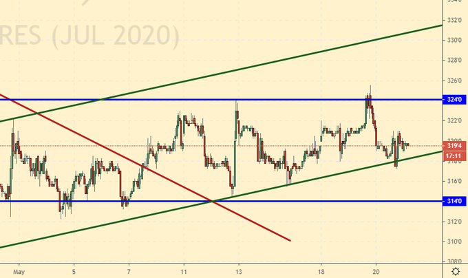 Кукуруза предпочла не реагировать на рост пшеницы и осталась парить в диапазоне. Здесь можно спокойно удерживать открытые ранее лонги. Добавить к покупкам можно будет в случае роста выше 325.0.