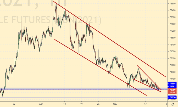 Продажа: после падения ниже 73700. Стоп: 74100. Цель: 71200.