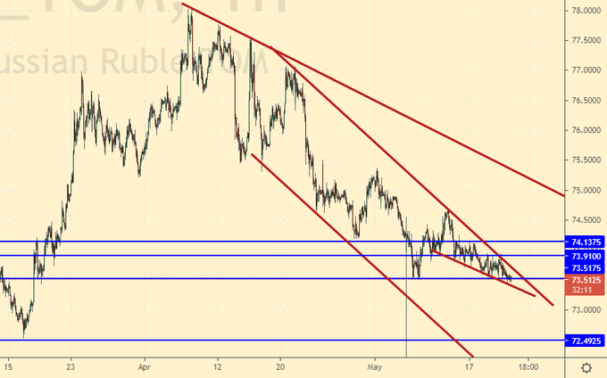 Рубль очень хочет пройти ниже 73.50. Если это произойдет, можно открыть шорт или нарастить уже имеющиеся позиции.