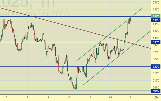 Против ожиданий рынок пшеницы перешел к росту, что вызывает вопросы, так как не ясно, что служит драйвером для такого хода. Да, продолжение конфликта в Черноморском регионе негатив, но его вряд ли должно быть достаточно для возобновления роста цен на фоне рапортов о рекордных ожиданиях на этот сезон. Впрочем, немного порадуемся за фермеров.
