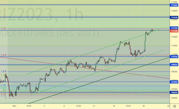 Читая наши прогнозы, вы могли взять ход вверх по фьючерсу на индекс РТС от 111500 до 113700.
