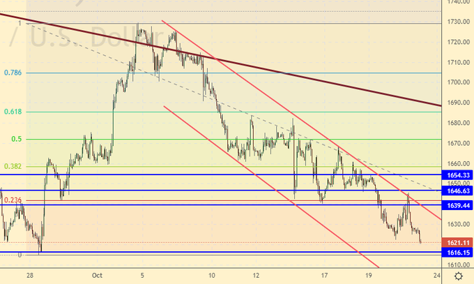 Золото с ужасом ждет заседания ФРС 2-го ноября. Покупателей пока крайне мало, рынок продолжает разряжаться. Анонсированная нами ранее отметка 1480 снова появилась в поле зрения. Держим шорты, рассчитываем на продолжение падения.