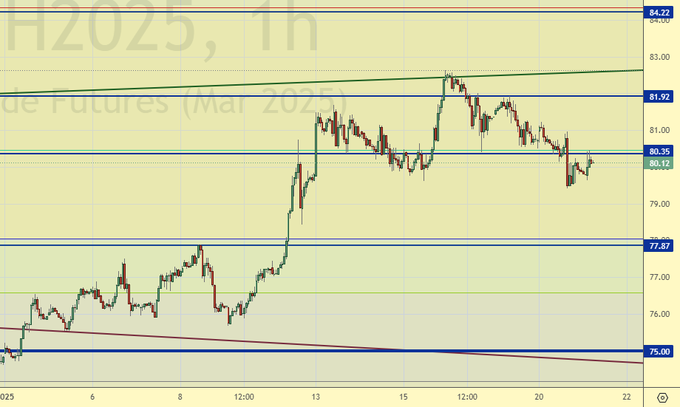 Продажа: при подходе к 84.20. Стоп: 84.70. Цель: 74.00. Кто в позиции от 80.64, держите стоп на 81.30. Цель: 75.00.