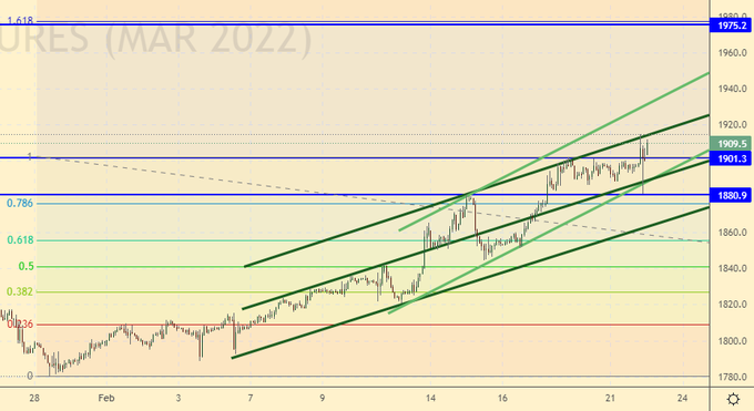 На фоне жестких действий Москвы золото продолжит свой рост к уровню 1975. Далее может последовать движение к 2000.0. Ответные шаги Европы на признание ЛНР и ДНР пока не ясны. Сегодня и завтра последую какие-то контрмеры, чем сильнее они будут, тем дороже будет стоить золото.