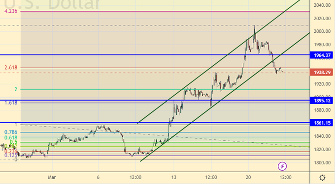 Откатываем. Данной ситуацией можно воспользоваться для покупок. Вход в лонг от 1890 и 1860 выглядит вполне разумно. Если сегодня ФРС поднимет ставку на 0.25% это как раз приведет к ходу к уровням поддержки, однако пройти ниже рынок вряд ли сможет.