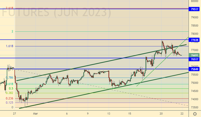 Покупка: при подходе к 75900. Стоп: 74900. Цель: 79500.