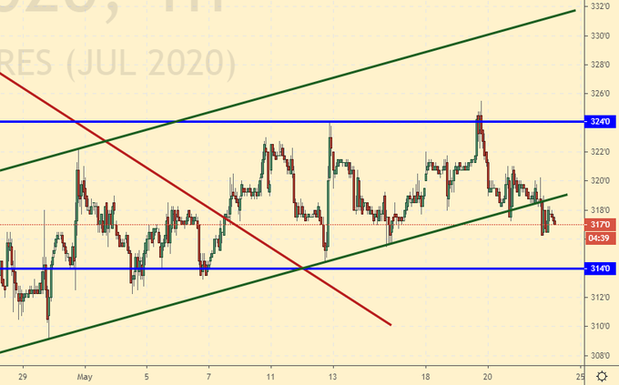 Кукурузе тяжело расти из-за великолепных прогнозов по валовому сбору. Цены покинули пологий растущий ценовой канал и отправились к поддержке 314.0. В случае прохода ниже, под угрозу взятия попадет уровень 300.0, что может привести к паническому сбросу на 250.0, а это уровень цен далекого 2006 года.