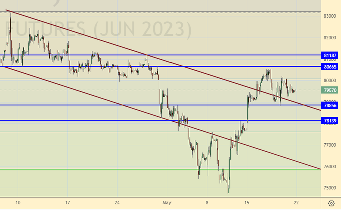 Продажа: нет. Кто в позиции от 80200, держите стоп на 80800. Цель: 73000.