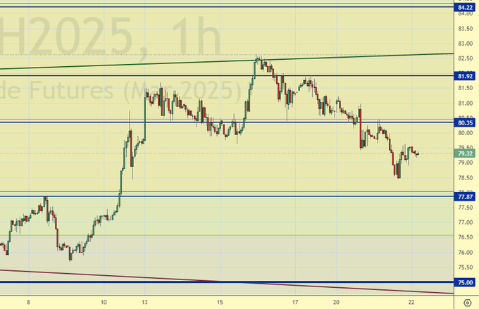 Если рынок нефти успеет опуститься к 75.00, то это будет неплохим шансом для входа в лонг. Отметим, что появление любых заявлений, которые можно будет трактовать как эскалацию между Россией и Западом, практически сразу приведет к росту цен на нефть.