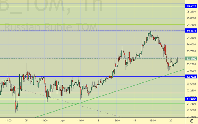 Стоим мы в узком диапазоне, что, учитывая характер предыдущего движения, сулит нам продолжение падения. Не исключено, что до 1-го мая не будет никаких действий.
