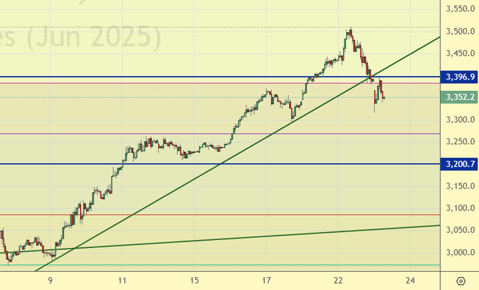 Выброс к 3500 сломал техническую картину. Теперь лучше постоять в стороне некоторое время. Будет откат к 3000 обязательно купим. В целом видна нервозность инвесторов.