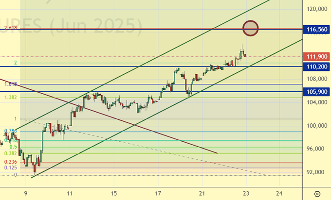 Очень хочется продать как можно выше, это нормальное желание. Поэтому, ждем 14700. При этом не отрицаем возможности продаж с текущих уровней. Касание 116500, станет предвестником более мощного роста рынка. Если медведи хотят 60000? То они не должны сейчас позволять рынку достигнуть 116500.