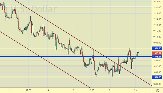 Пока, за счет падающей тенденции, толпа будет отдавать предпочтение продавцам, но продажи с текущих уровней не выглядят оптимальными. Возьмем на сегодня паузу. Для подтверждения хода вверх нам надо взять 1905.