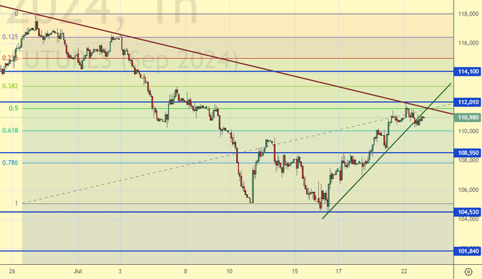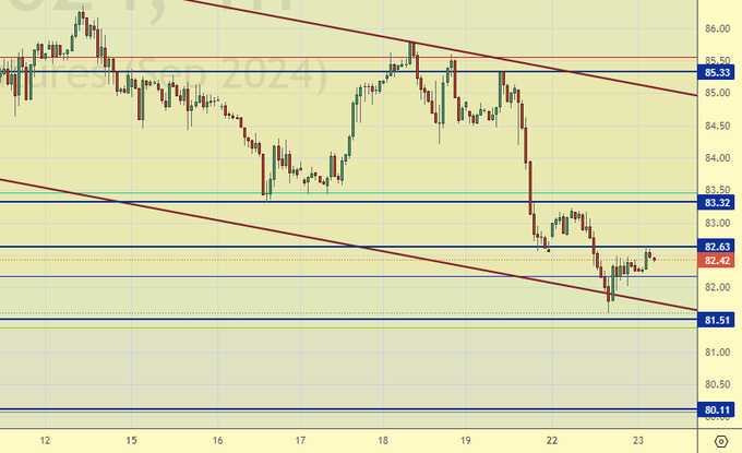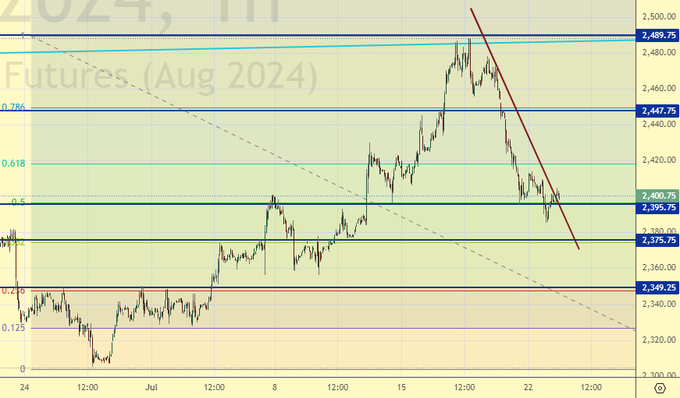 До заседания ФРС 31-го числа не видим смысла в сильных движениях вверх или вниз. Скорее всего, мы будем тяготеть к формированию диапазона между 2400– 2460. Пока доллар не обязан сдавать позиции. Тем более, что уход со сцены старика Байдена делает вероятным приход к власти человека с работающей головой. Пусть и плохой, пусть и с дырявым ухом.