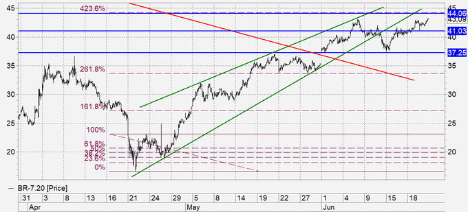 Покупатели пытаются протолкнуть рынок к 44.00. Подъем к 45.00 возможен исключительно на эмоциях, после чего должен последовать откат. Коррекция назрела, так как рынок растет без значительных остановок с 20-х чисел апреля.