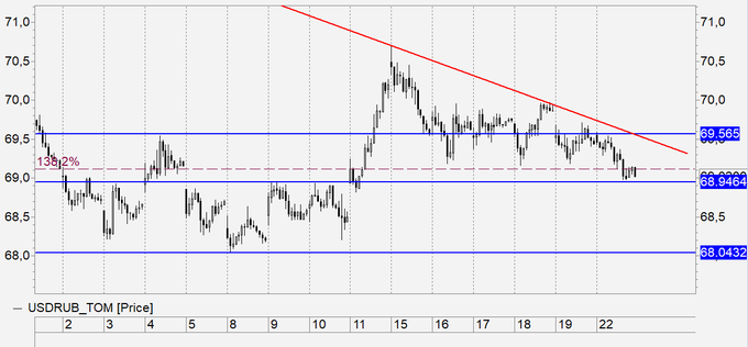 На фоне продолжающей дорожать нефти видим небольшое укрепление рубля. Проход ниже 68.90 может вызвать сброс к 68.05. Так как мы ждем начала падения цен на рынке нефти, нам сложно рекомендовать продажу пары. Проход вниз рассматриваем пока лишь как шансы купить дешевле.