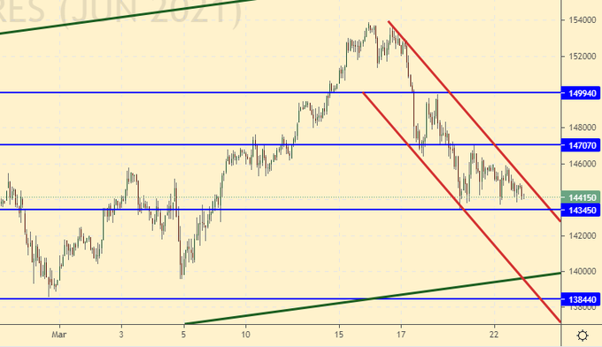 Рубль падает, на этом фоне возможен краткосрочный всплеск интереса к покупке российских акций. Ориентируемся на поддержку в районе 143000. Если она устоит, то можно рассчитывать на ход к 150000. Более сильный рост пока не просматривается. Если же мы сегодня сможем пройти ниже 143000, то внизу нас ждет 140000.