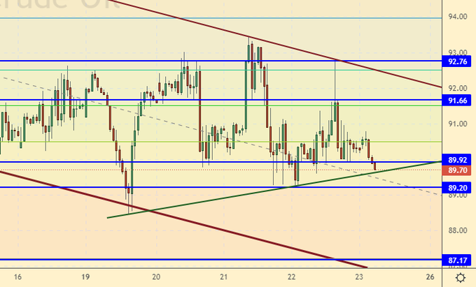 Рынок нефти продолжают подталкивать к локально значимой поддержке на 89.20. Если удастся пробиться ниже, то можем возникнуть соблазн пройти к 80.00. Однако, в текущих обстоятельствах относиться к возможному падению рынка нефти надо осторожно.