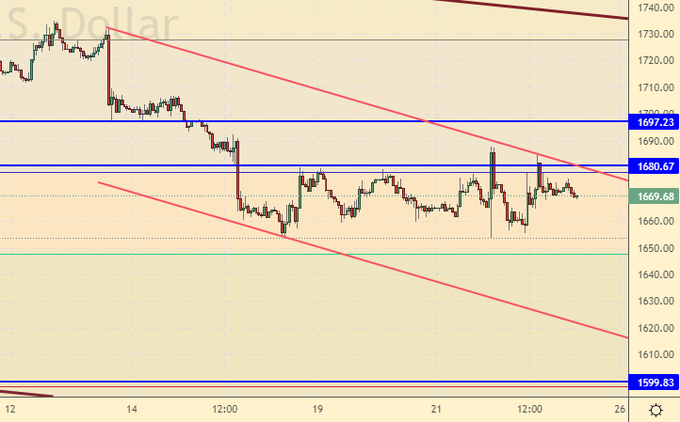 Учитывая напряженность в мире, позиция продавцов достаточно уязвима и это даже несмотря на то, что от ФРС ждут роста ставки выше 4% до конца года. Цель на 1600 пока оставляем, но признаем, что всё может измениться на рынке за 1 час.