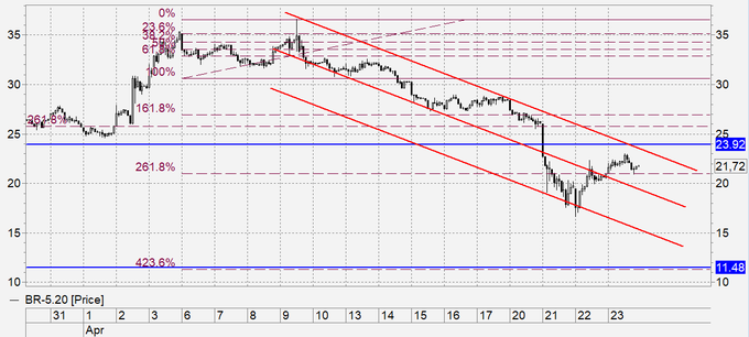 Продажа: возможна в случае падения ниже 21.00. Стоп: 21.80. Цель: 15.00. Или при подходе к 24.00. Стоп: 25.20. Цель: 12.00.