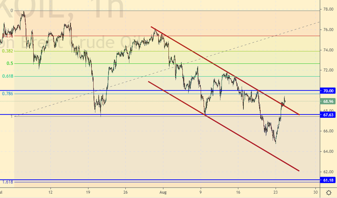 Продолжаем считать, что пока мы находимся ниже 70.00, шансы на падение рынка к 61.50 остаются. Желающие могут продавать с текущих уровней с короткими стоп-ордерами.