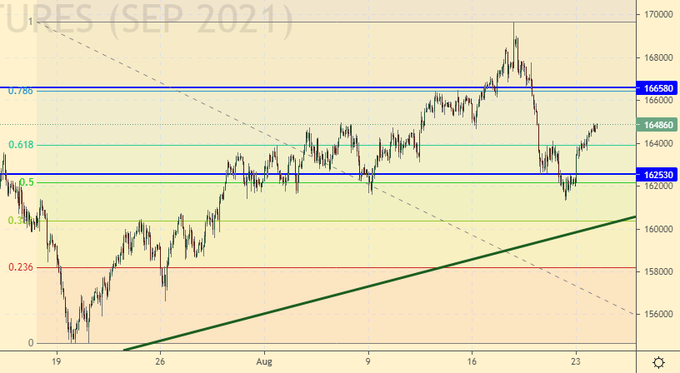 Накануне мы не поверили в способность рынка пробить поддержку в районе 160000, основываясь на том, что доллару не хватает фундаментальной силы для того, чтобы фондовые рынки испугались его неожиданного укрепления. В подтверждение этого предположения SP500 поставил новый рекорд вчера. Народ пока не торопится покупать облигации. Резкую смену настроения против доллара в понедельник можно объяснить и тем, что речь Пауэлла для симпозиума в конце этой недели уже написана, и кто-то её прочитал. Видимо, в ней нет ничего хорошего для любителей держать деньги на счете в банке.