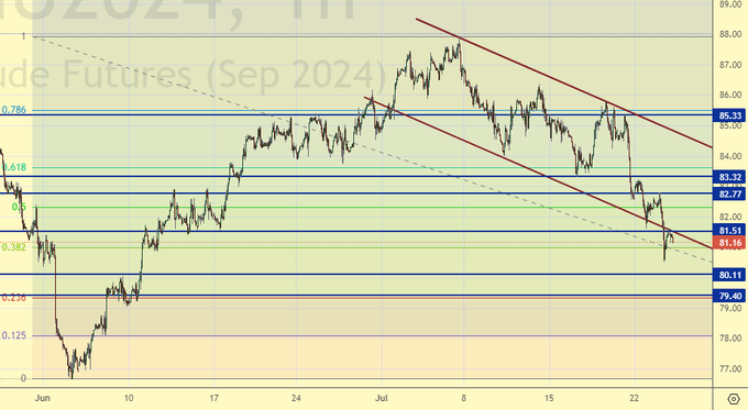 Нефть пока отступает. Не зная, чем объяснить сие явление, ряд писателей стали вплетать сюда возможность перемирия в Газе. Ах, да в далеких Парижах Олимпиады. Мы же «вплетем» завтрашний выход данных по ВВП США за 2-й квартал. Вот если он окажется хуже ожиданий, то тогда будут пробовать на прочность уровень 80.00, к которому мы ожидаемо спустились с 85.00.