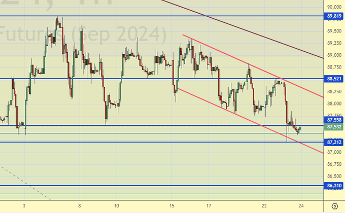 Продажа: нет. Кто в позиции от 89000, перенесите стоп на 89100. Цель: 75000.