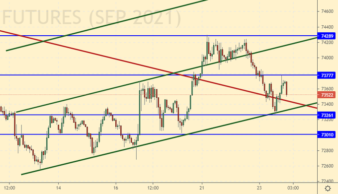 Покупка: сейчас. Стоп: 73100. Цель: 80000. Кто в позиции от 73200, перенесите стоп на 73100. Цель: 80000.