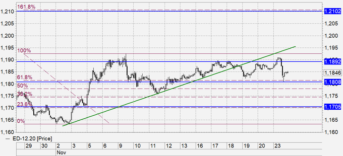 Прорыв выше 1.1900 закончился неудачей. Доллар рос вчера на фоне новостях об очередной вакцине, а также на экономических данных: индекс деловой активности в промышленности в секторе услуг вырос до 56.7 и 57.7 соответственно. Это значит, что нас ждет сильное улучшение на рынке труда, так как компании нанимают рабочих.