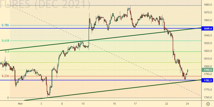 Золото «отпраздновало» крайне вероятное переназначение Пауэлла на новый срок. Падение ниже 1780 может привести к доминированию доллара над золотом, что в текущих условиях воспринимается как откровенный блеф. Пока фондовый рынок США чувствует себя хорошо, золото будет обороняться от безумных продавцов, однако, в случае изменения ситуации нас ждет рассвет драгоценных металлов.