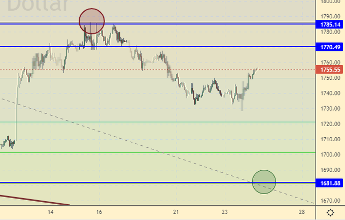 При подходе к 1770 продавцы должны атаковать. Если этого не произойдет, то нас ждет рост выше 1800, что может привести к быстрому разгону котировок к 2000. Нам придется покупать по 1800 если не будет отката к 1680. Пропускать ход к 2400 нельзя.