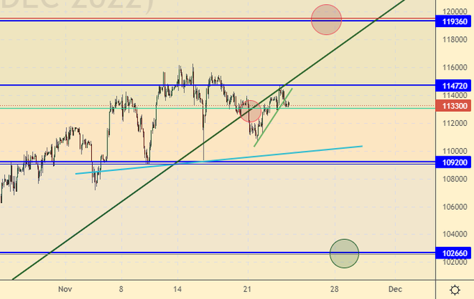 Быкам очень хочется пробиться к 120000. Но, настроение портит перспектива получить от Запада в ультимативном порядке уровень цен на нефть, а также затормозившийся в росте Китай. Фундаментально – обоснованных причин сейчас для возобновления роста нет. Только надежда на лучшее заставляет покупать инвесторов сейчас.