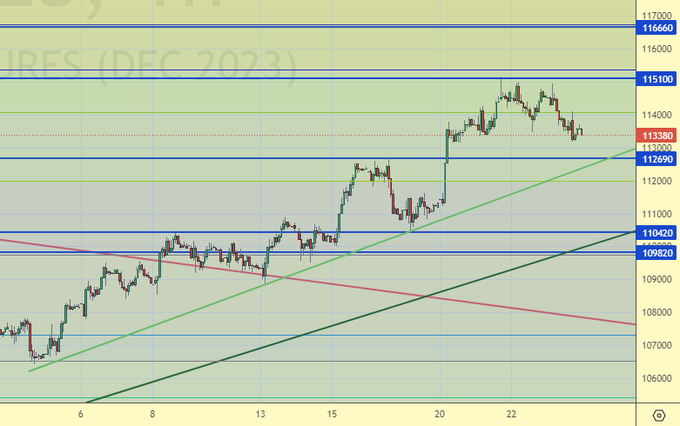 Есть шансы на развитие коррекции к 103000. Сбербанк почти завершил свой растянутый импульс с 22-го года. Если рынок развернется вниз вместе со слабеющим рублем, то тогда индекс РТС достаточно быстро сходит вниз.