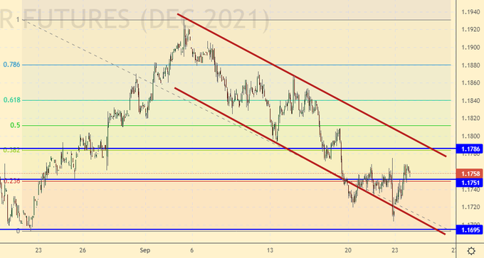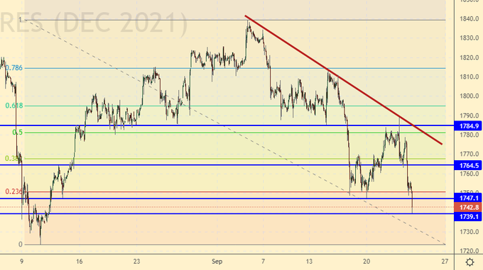 Утром рынок встретил поддержку в районе 1740. Цены не хотят падать, хотя усилия медведей просматриваются. По факту доллар ничего не может продемонстрировать, так как заявления ФРС связаны с весьма далеким будущим. Ничего позитивного для американской валюты в ближайшие полтора месяца происходить не будет. Более того, как бы 1 октября американцам не получить дефолт по обязательствам, если закон о росте долга не будет принят конгрессом.