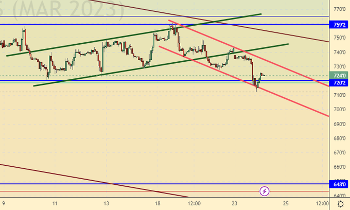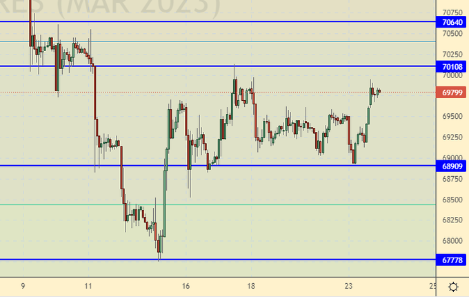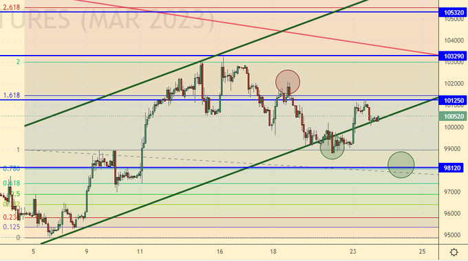 Отскочили вверх от 99000. Ход во многом дежурный и ничего не определяющий. Зато он позволяет пододвинуть покупателям стоп-ордера вверх для того чтобы не отдавать много рынку в случае продолжения падения. Сбербанк единственный кто тащит рынок вверх, так как там ждут хороших дивидендов за 2022-й год. Нефтегазовый сектор ничего хорошего не ждет: он продолжит грустить, чем будет сильно портить картину.