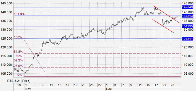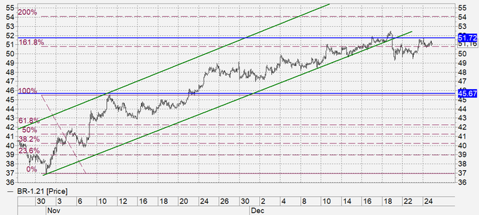 На календаре у нас католическое Рождество. Рынок пытается убедить нас, что после Нового года он пойдет вверх. Да, возможен вариант, когда мы идем на 56.00, и только потом откатываем к 50.00, но он расходится с ожиданиями участников рынка, да и с самой экономической ситуацией. Более естественный вариант – это ход на 46.00.