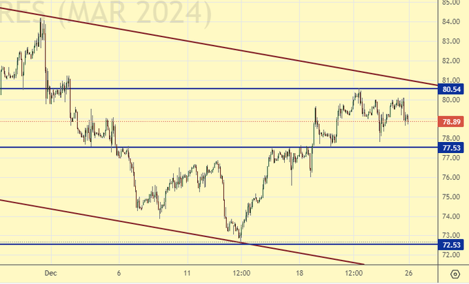 Подъем нефти выше 82.50 будем рассматривать как предпосылку для хода к 100.00. Произойти это может в случае, будем писать как есть далее, в случае подрыва танкера в Красном море, что приведет к экологической катастрофе. Вот тогда котировки пойдут верх. Во всех остальных случаях, мы можем рассчитывать на то, что рынок будет склонен к охлаждению.